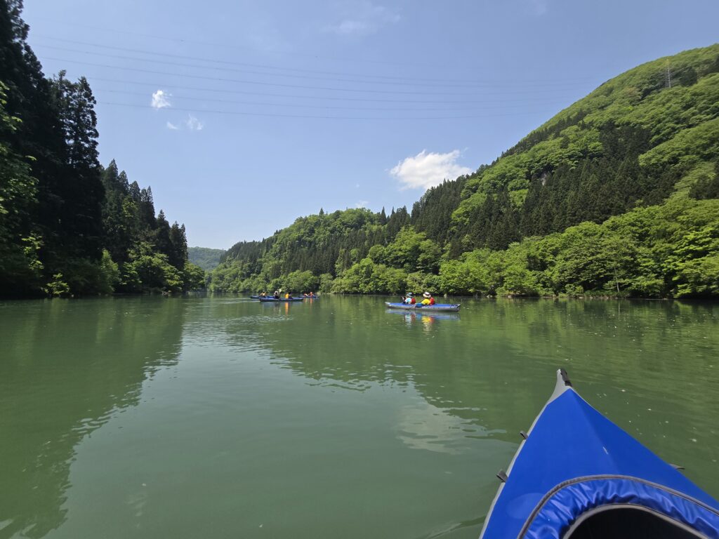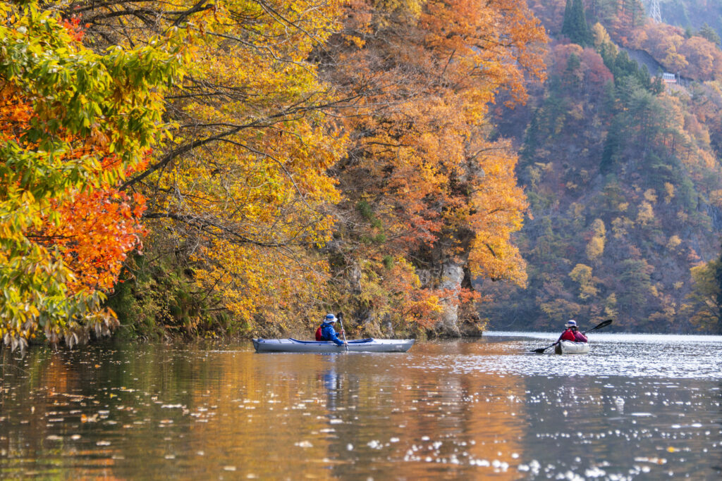 只見川の上田ダムと宮下ダムに挟まれた幻想的なエリアを、カヤックでゆっくりと進みます。